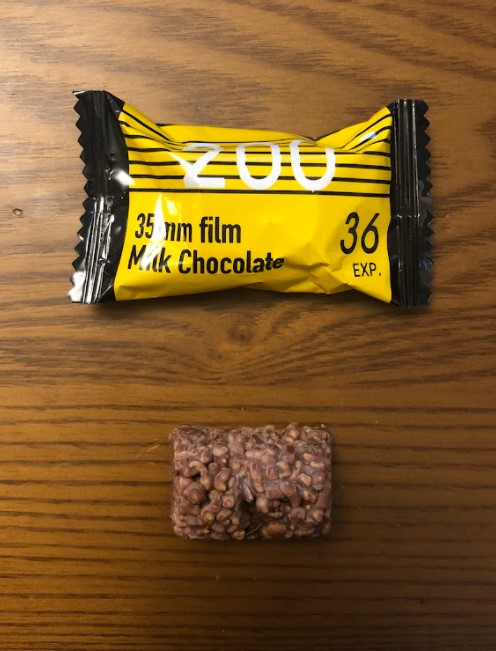 カメラ缶望遠レンズの中のお菓子はクランチチョコレート5個入りです。