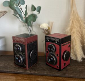 木製のカメラ、「インスタントカメラ木箱」・「レフレックスカメラ木箱」という商品もあります。