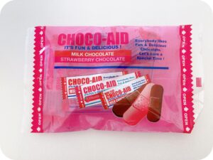 絆創膏の形をしたチョコレートです。ブルーの方は注射器と薬瓶の形もあります。ピンクはストロベリーチョコレートも入っています。