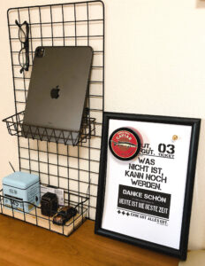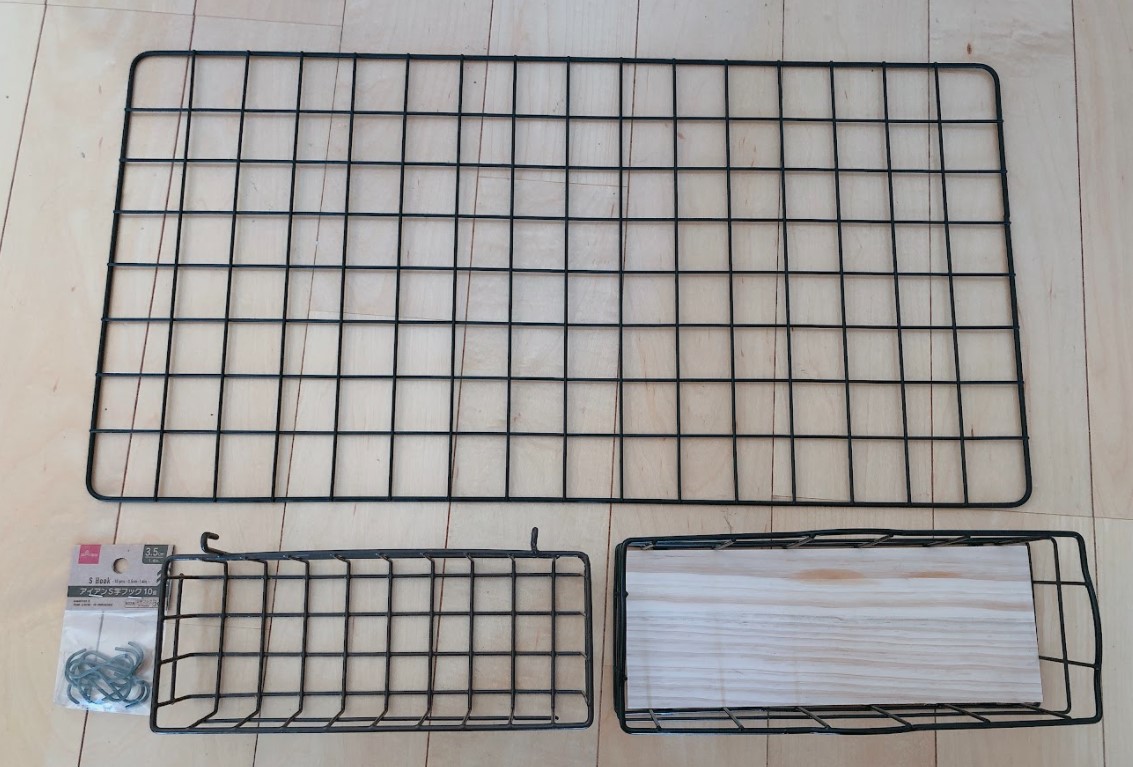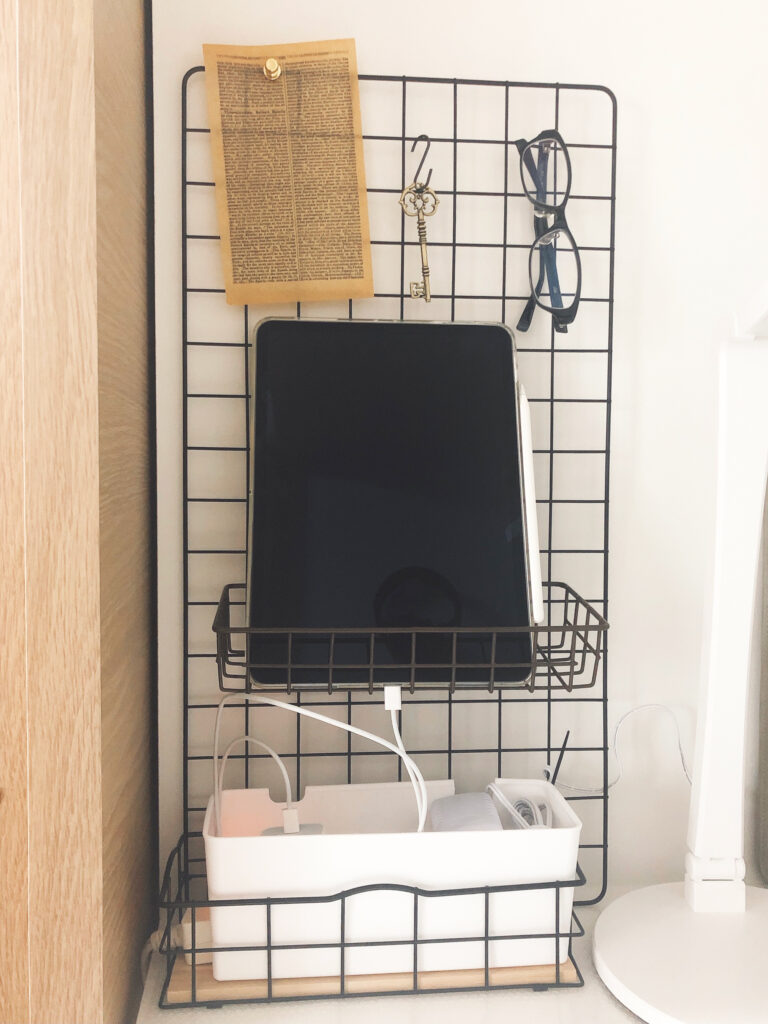 付けられたら、DAISOで買ったアイアンバスケットや、 アイアンS字フックをひっかけてラックとして使いましょう。 iPadが置けるサイズのワイヤーバスケットもあるので、 いろいろ試してみてくださいね!