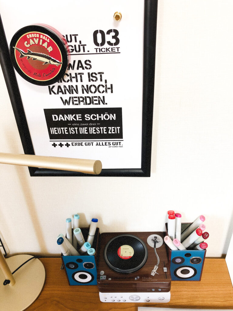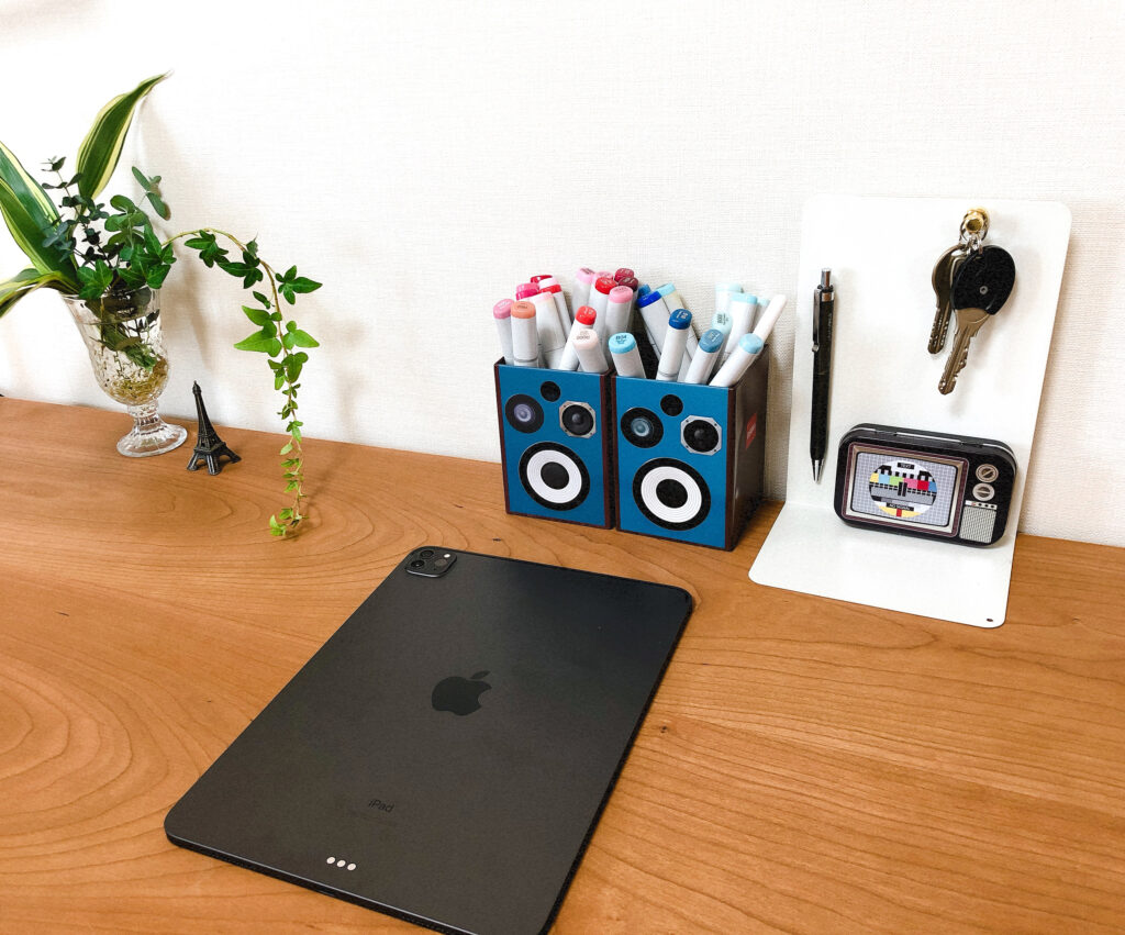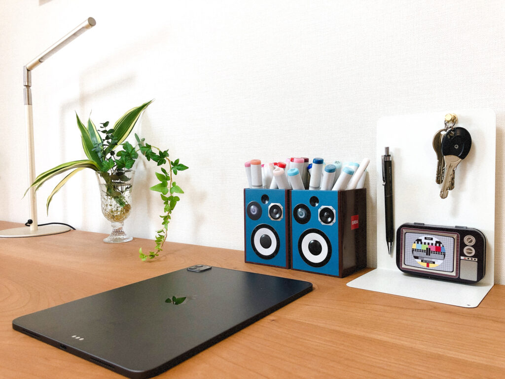 スピーカー缶はふたを取ってペン立てに。 四角柱の形は、デスク上でもデッドスペースが出来ず、スッキリした印象。