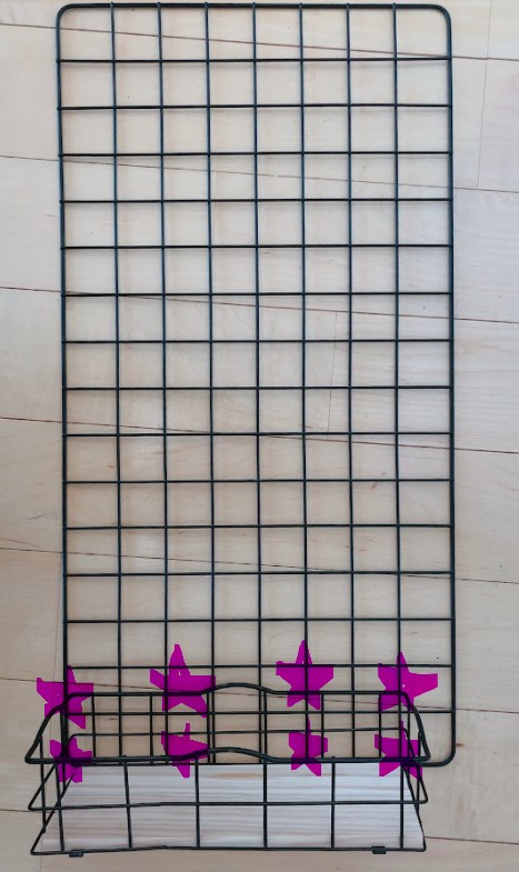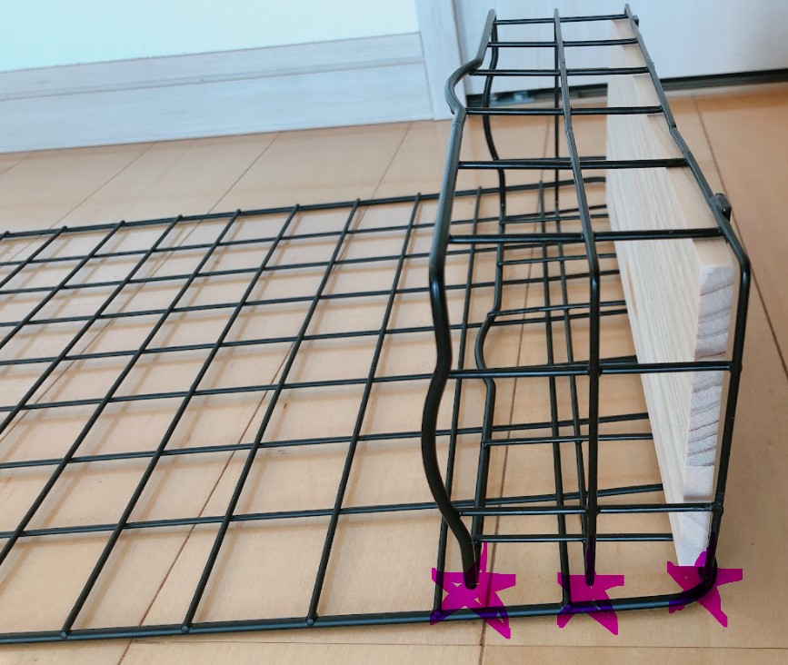 ワイヤーネットとカトラリー入れを90度にセットします。 まずは★のあたりを結束バンドでとめましょう。 反対側の三か所も結束バンドでとめていきます。