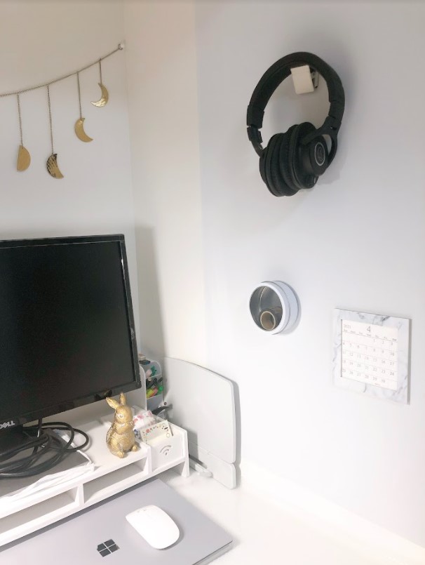 デスクまわりでよく使うグッズをまとめて貼っておくと便利です。 ミニ缶の中にはクリップなどのよく使う文房具を入れておきましょう。