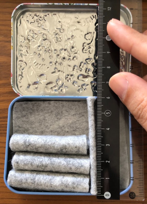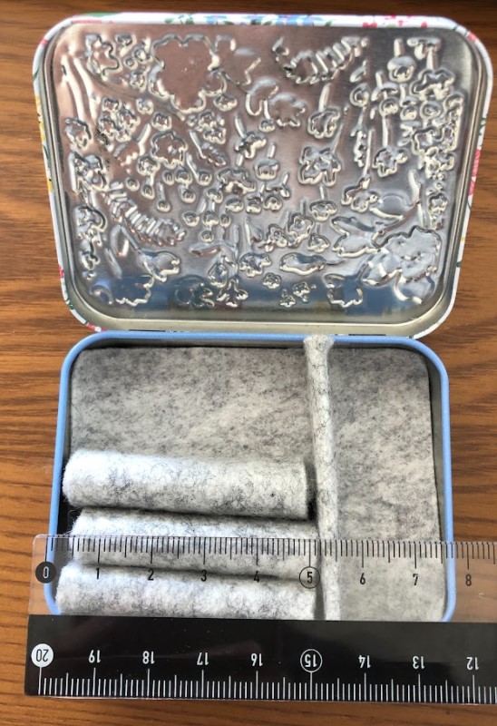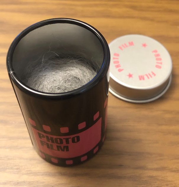 フェルト玉が固くなってきたら写真フィルム缶に入れます。 |