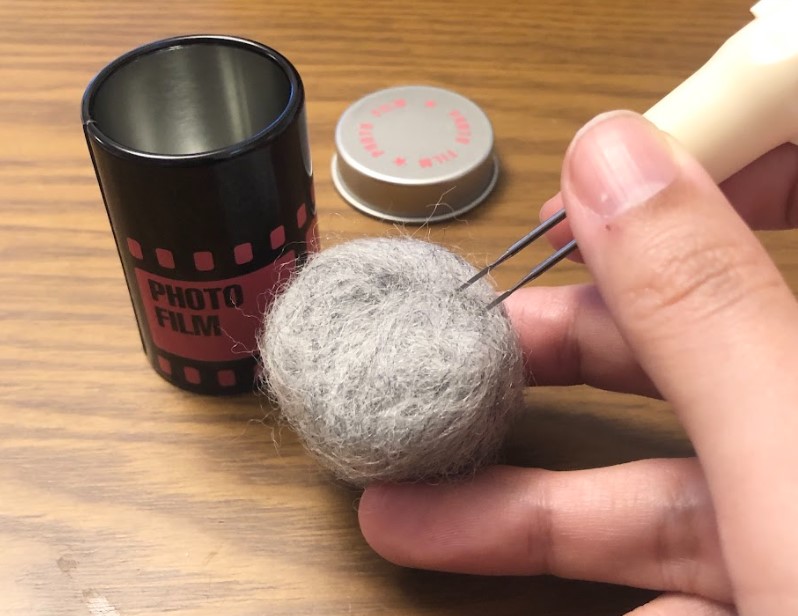 フィルム缶のサイズに合わせてフェルトをちぎったら、 ニードルでぶすぶす刺してフェルトを固めます。 |