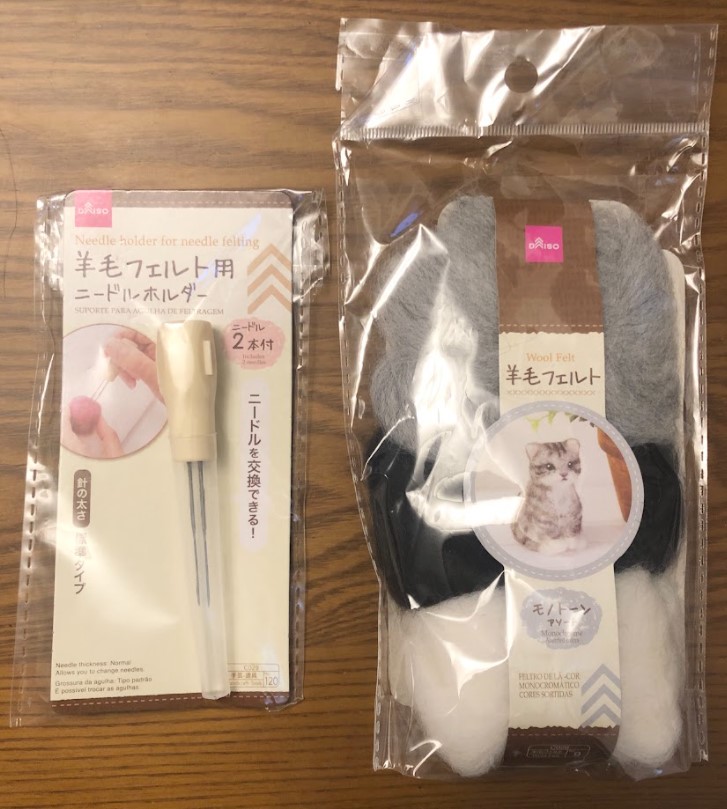 今回はDAISOで売られている針と羊毛フェルトを使いました。 |