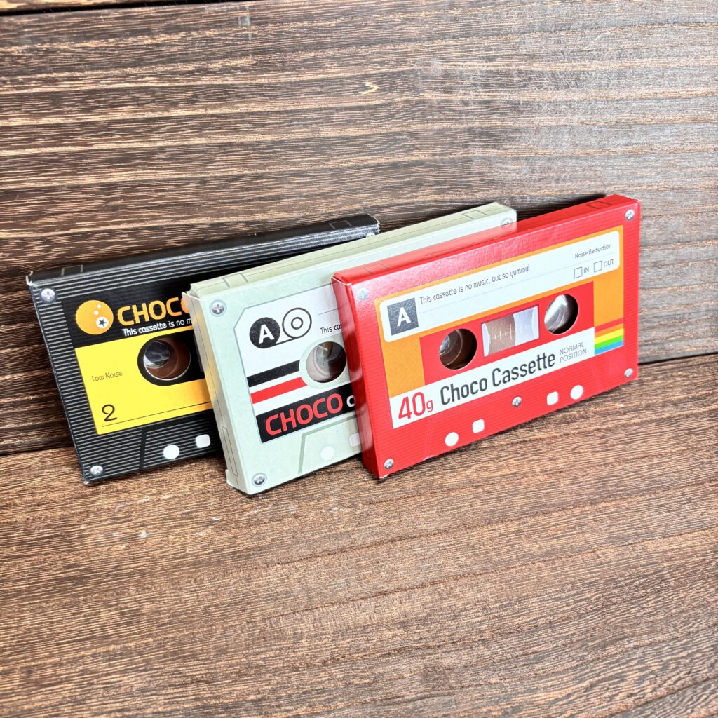 チョコカセットは紙箱の商品で、色はレッド、ホワイト、ブラックの3色で販売しております。