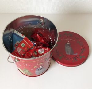クリスマスデザインのネコのバケツ缶です。
