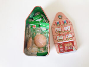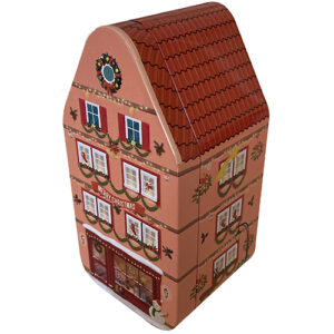 クリスマスプレゼントの形をした缶です。