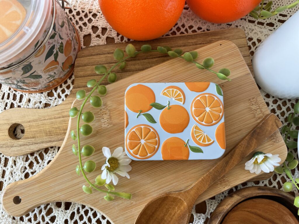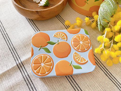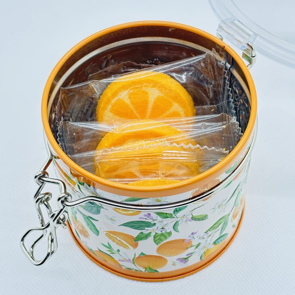 オレンジ柄の元気いっぱいなミニ缶です🍊 プチギフトにぴったりです🎀