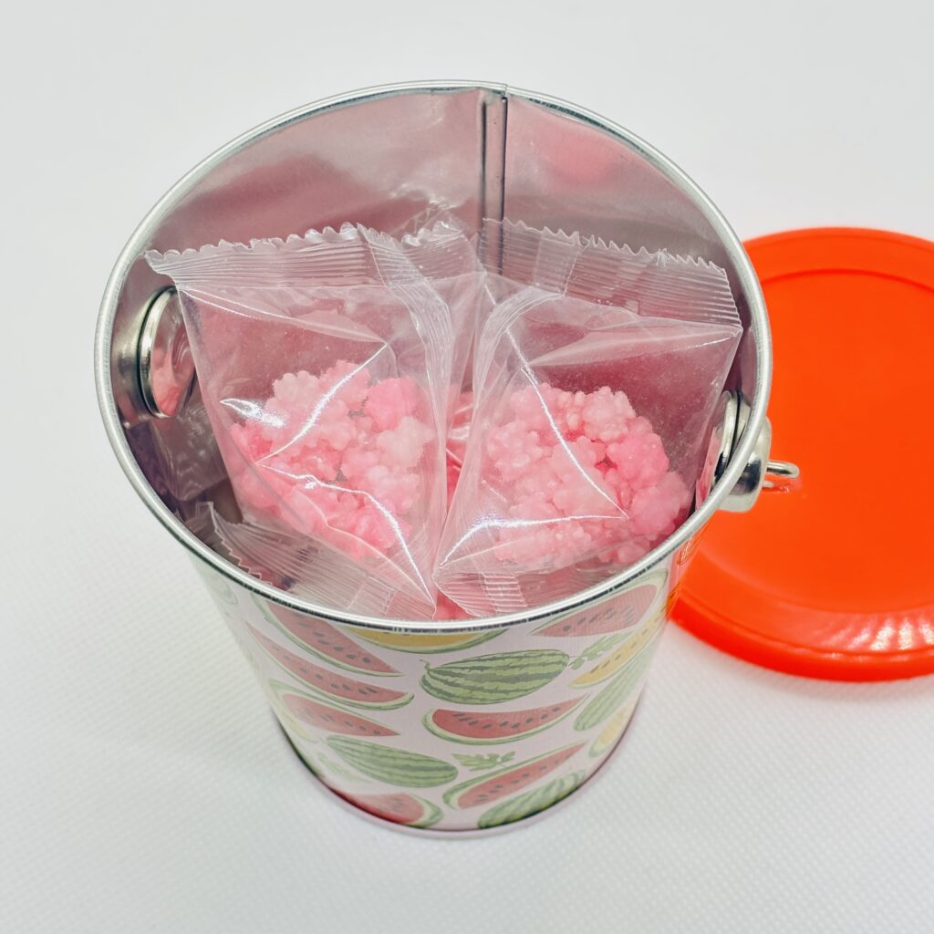 すいかデザインが楽しいバケツ型缶です🍉 お菓子たっぷりでギフトにもおすすめ🎁