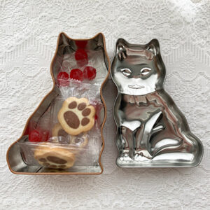 ネコをかたどった缶の商品。中には肉球クッキーとストロベリー風味のキャンディ入り。