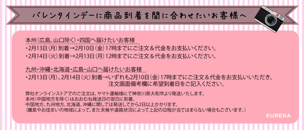 本州(広島、山口を除く)なら2月13日(月)12時までのご注文分なら14日着に間に合う可能性が高いです。