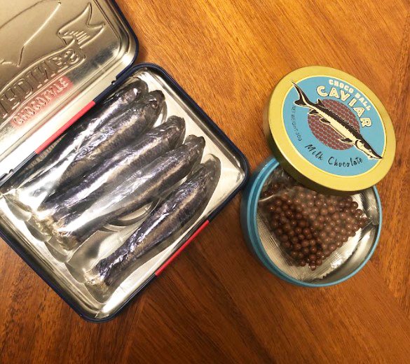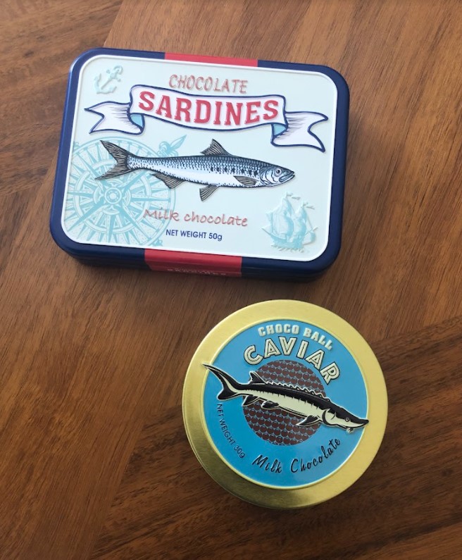 チョコサーディンにはイワシプリントのアルミ巻きチョコレート。