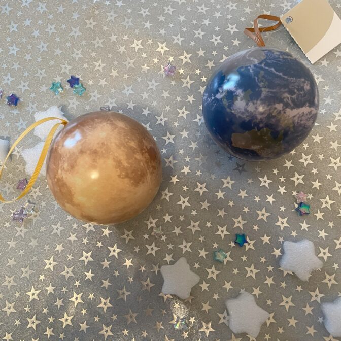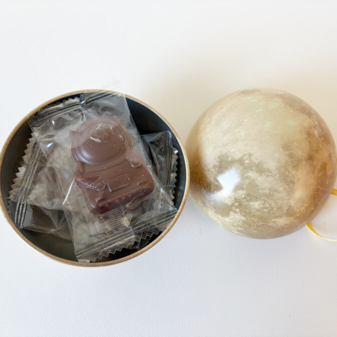 宇宙デザインのチョコが3個入っています。)テラ缶(地球のデザイン)もございます。