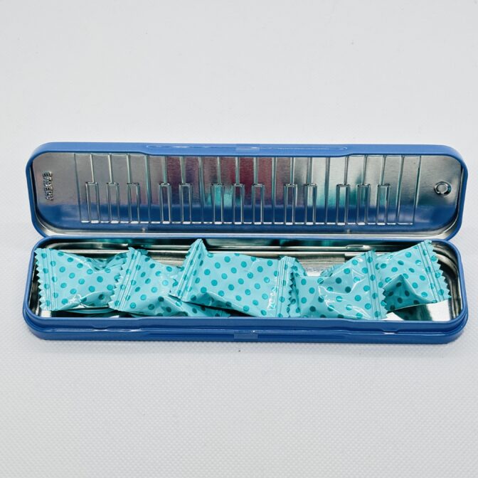 鍵盤ハーモニカを模した缶です。懐かしい鍵盤がスリムなサイズになって手軽で可愛いです。