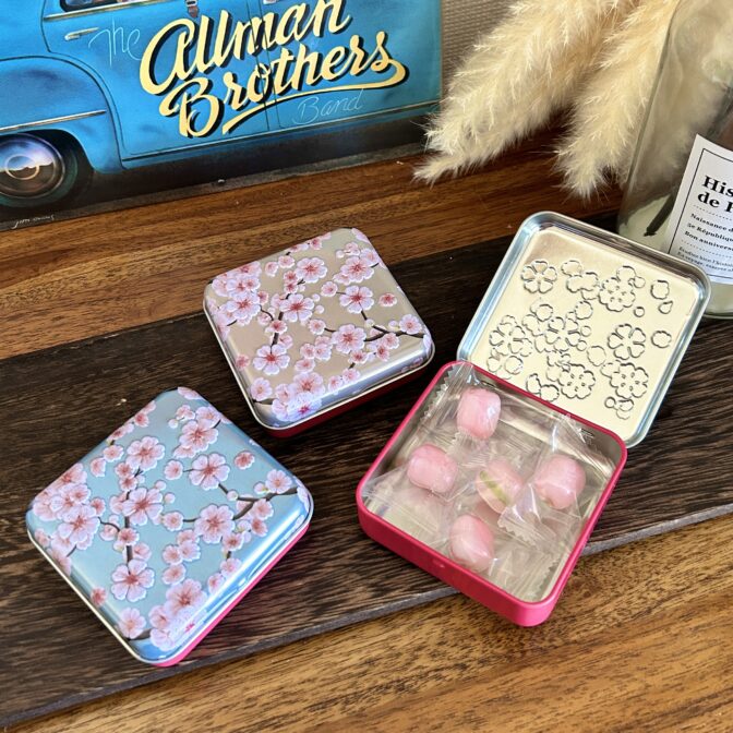 春らしいさくら柄のミニ缶です。中にはさくらんぼ風味のキャンディが入っています。
