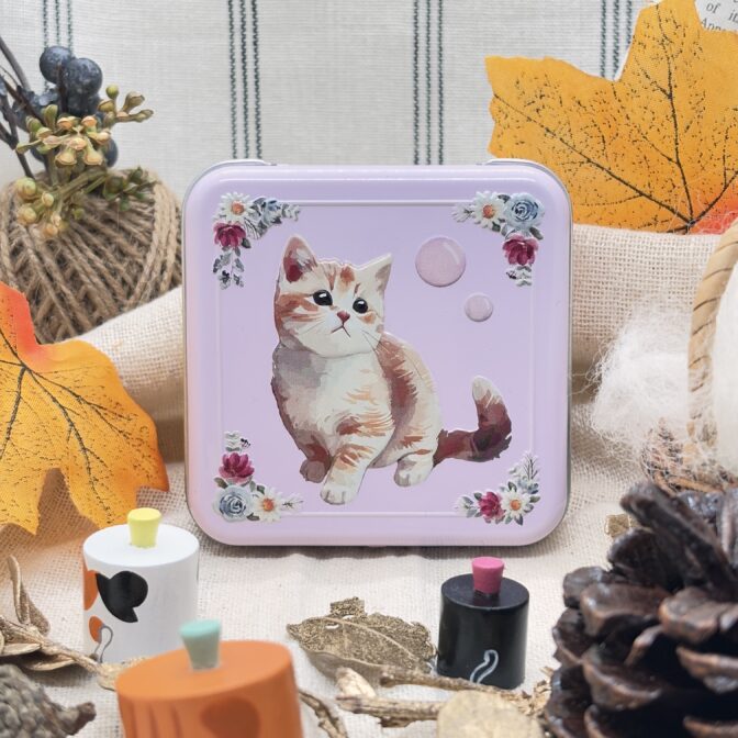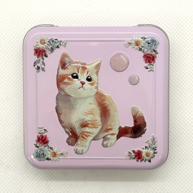 エンボス加工を施したネコのミニ缶です。