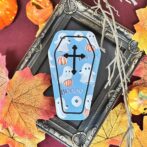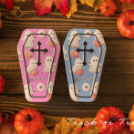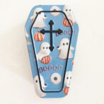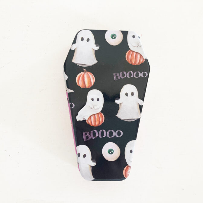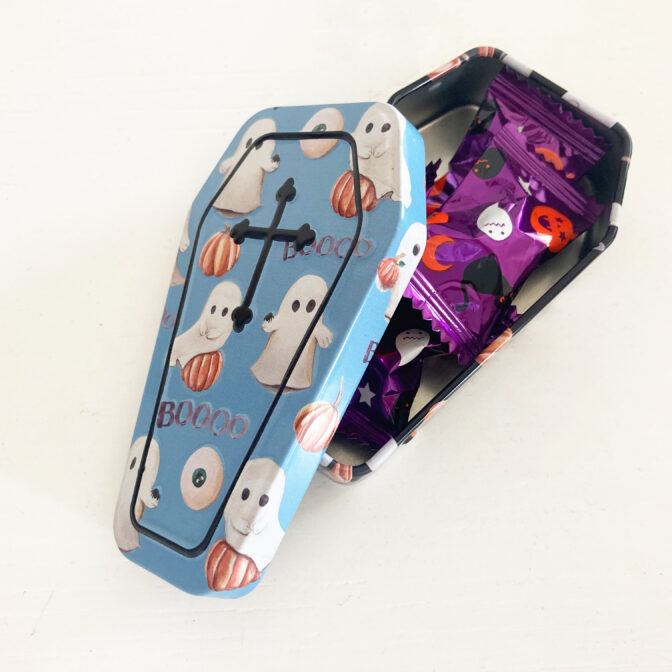 ハロウィンデザインの棺の形をしたキャンディ入りの缶です。