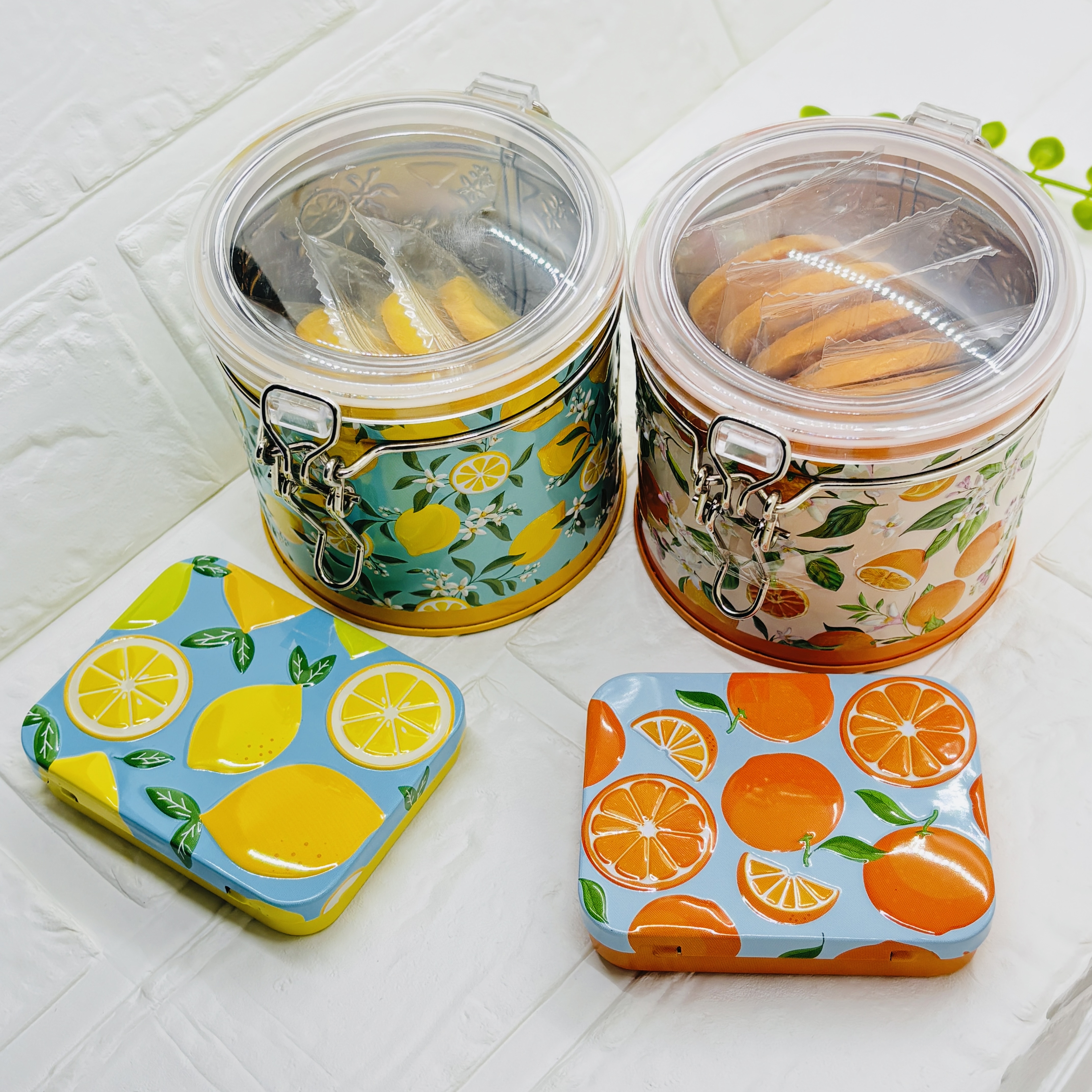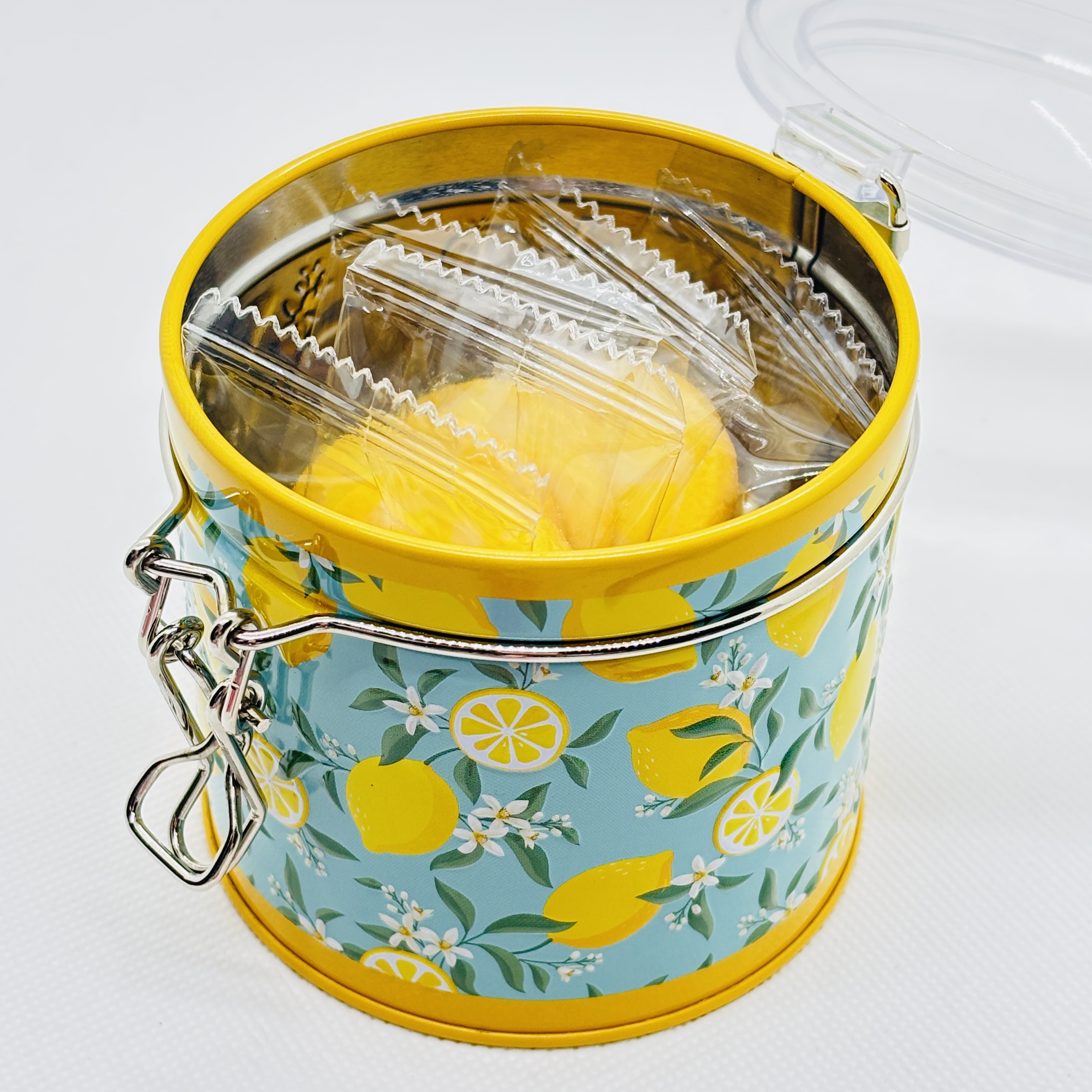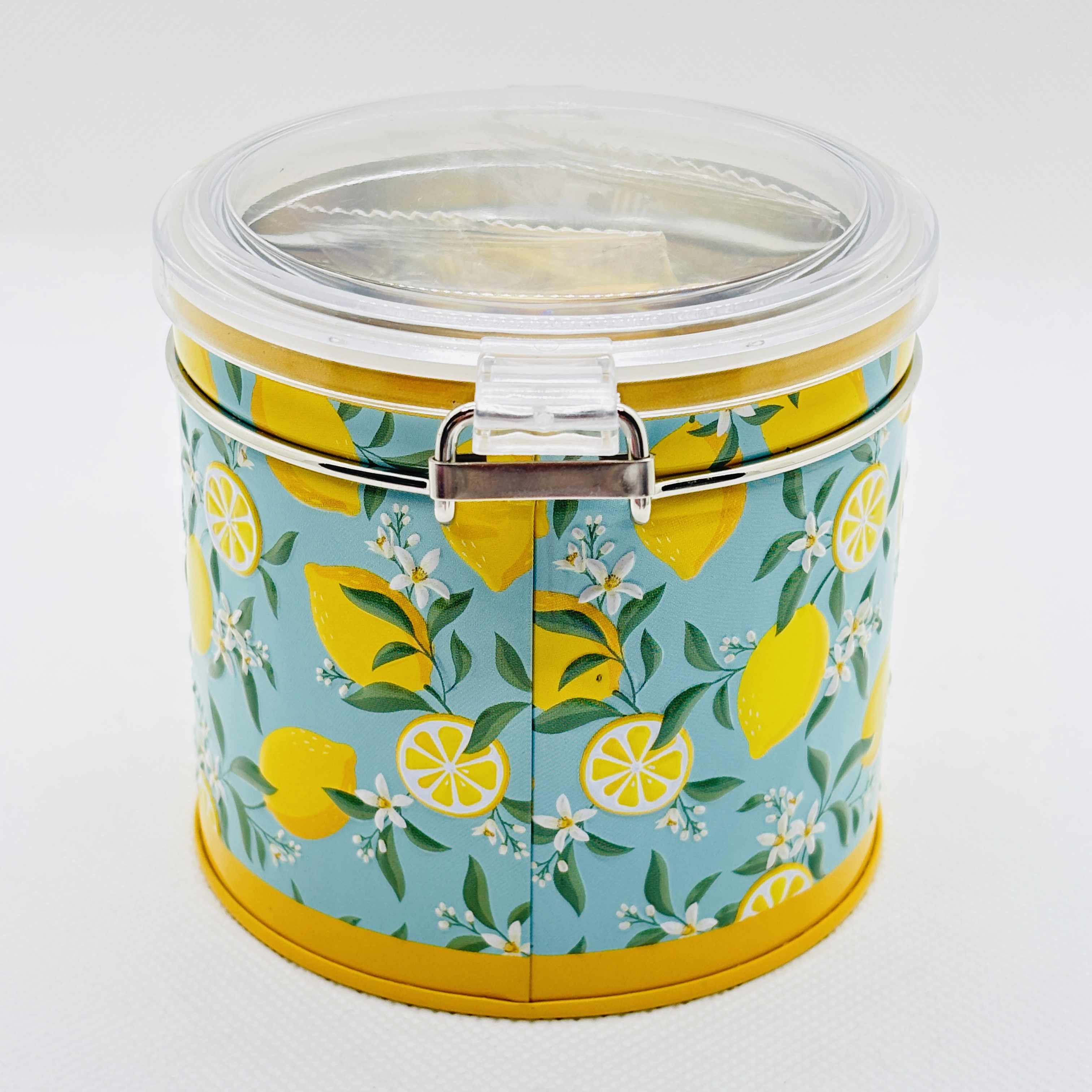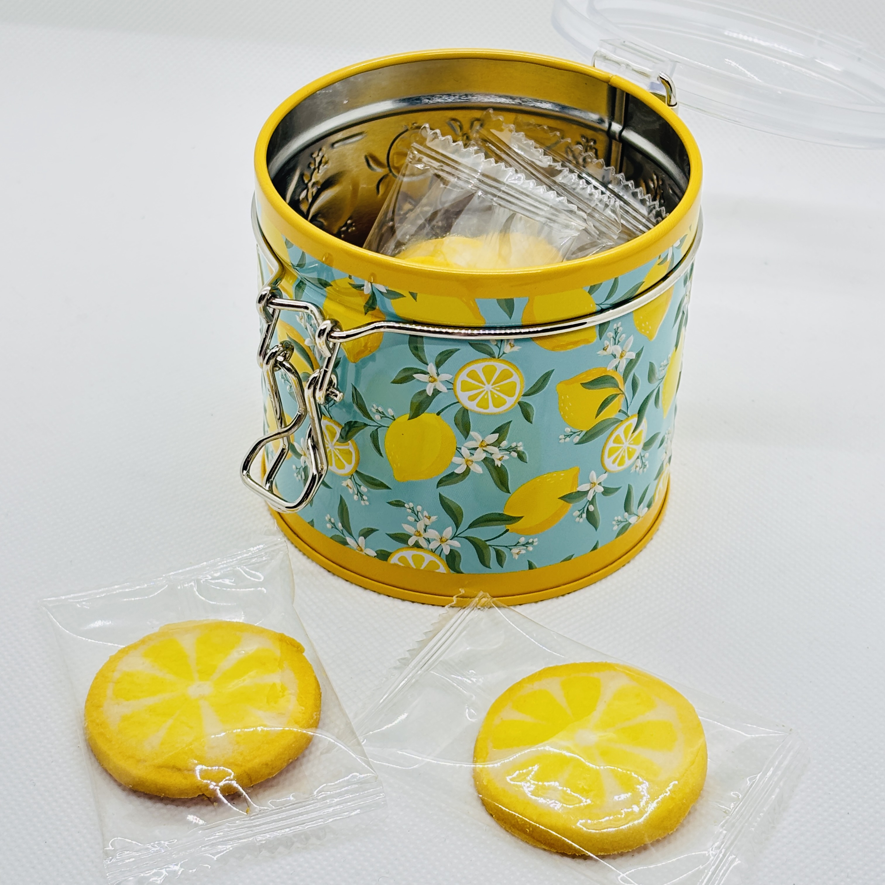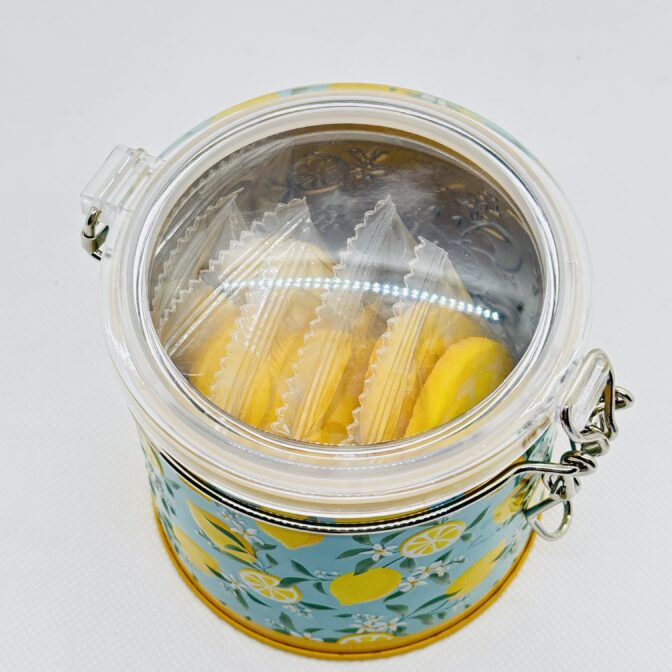 フタが透明で中身が見えるタイプです。 レモンの断面の様なデザインのクッキーが入っています。