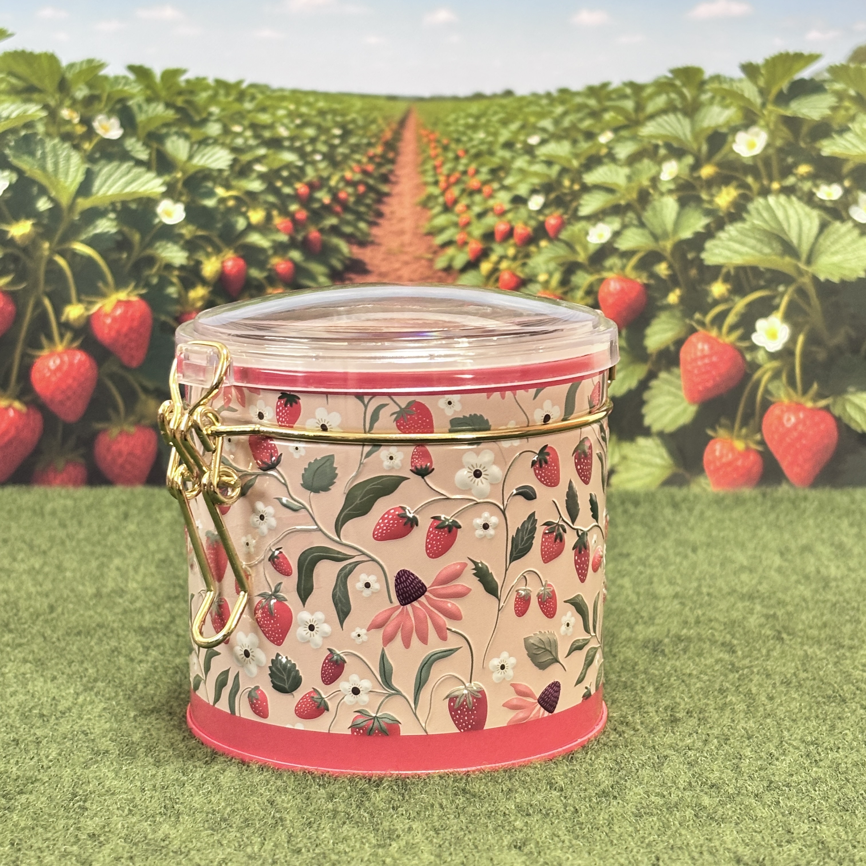エンボス加工を施したストロベリー柄のクッキー缶です。