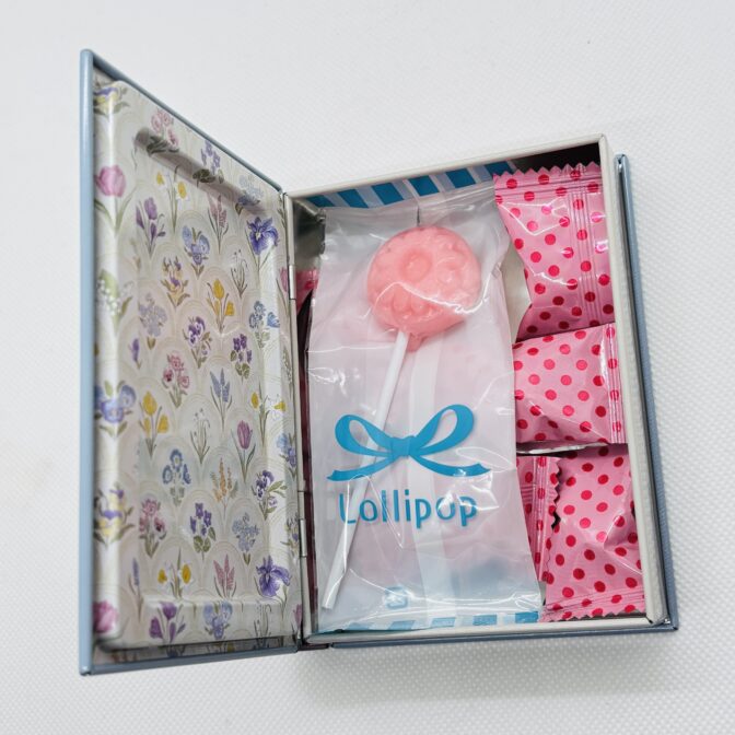 イチゴミルク風味の棒付きキャンディ1個と、パイナップル風味キャンディ7個が入っています。