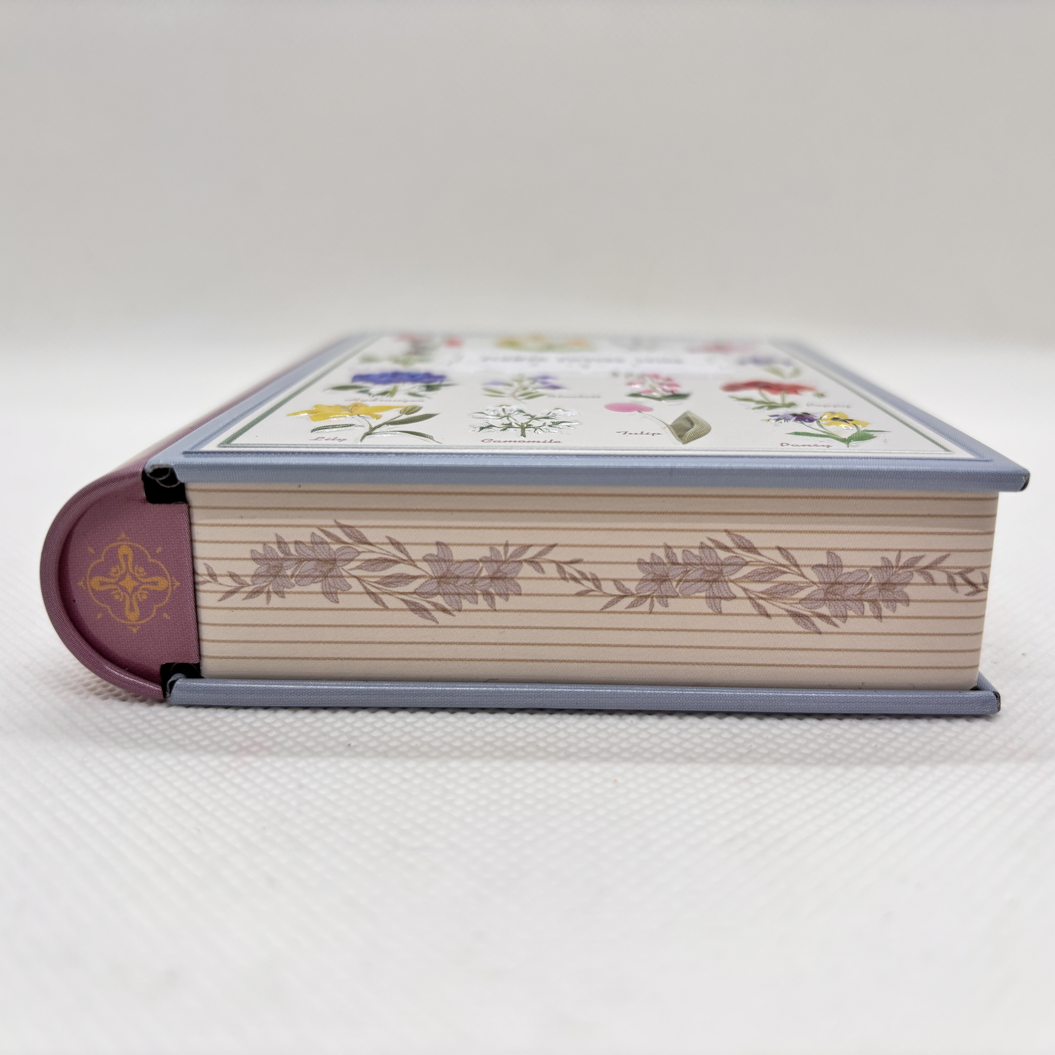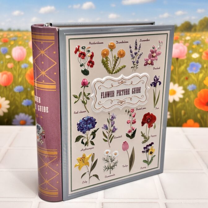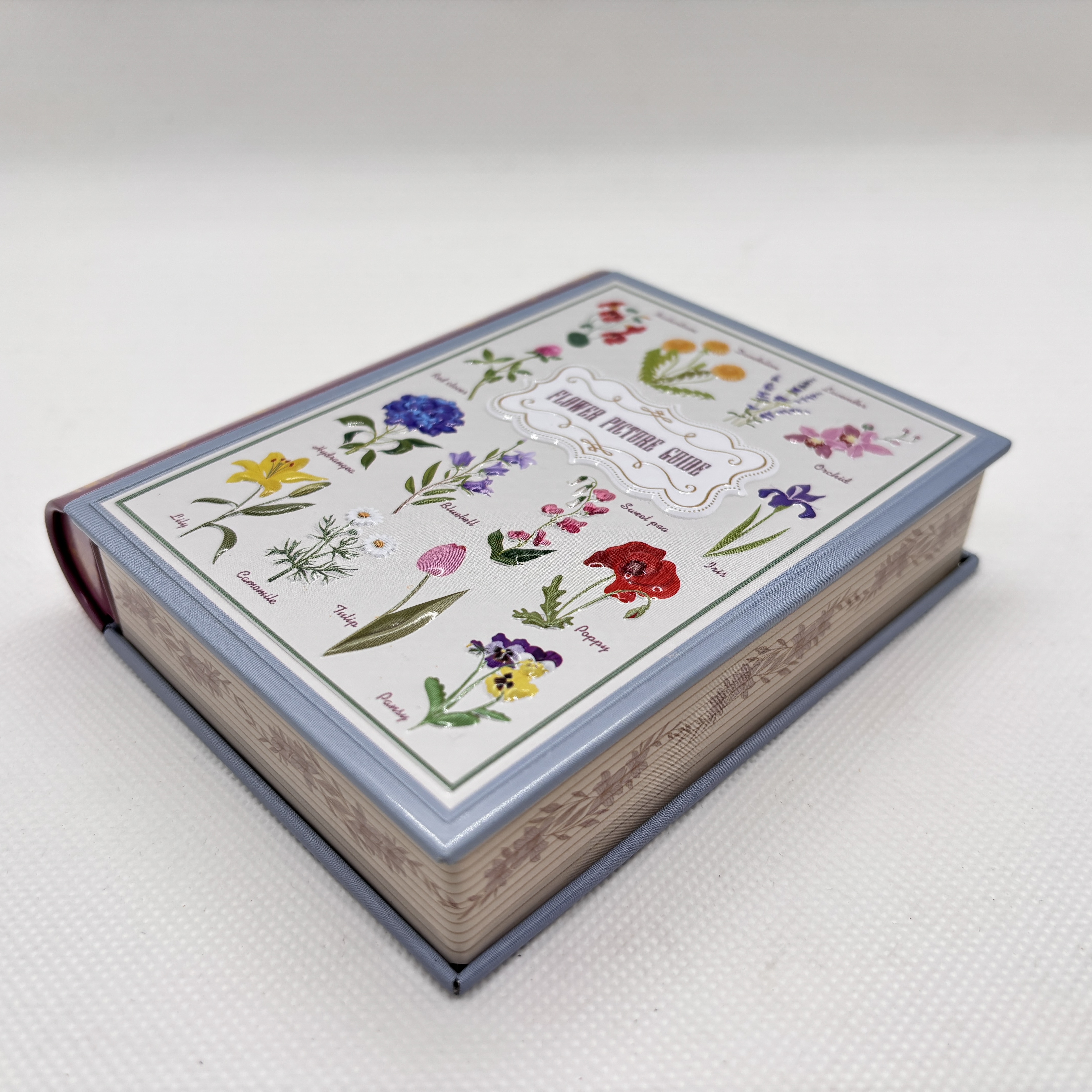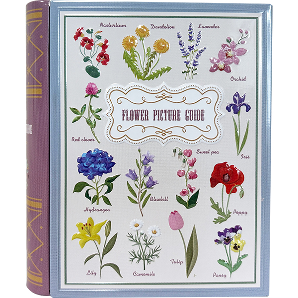 花の図鑑をデザインし、エンボス加工を施したブック缶です。