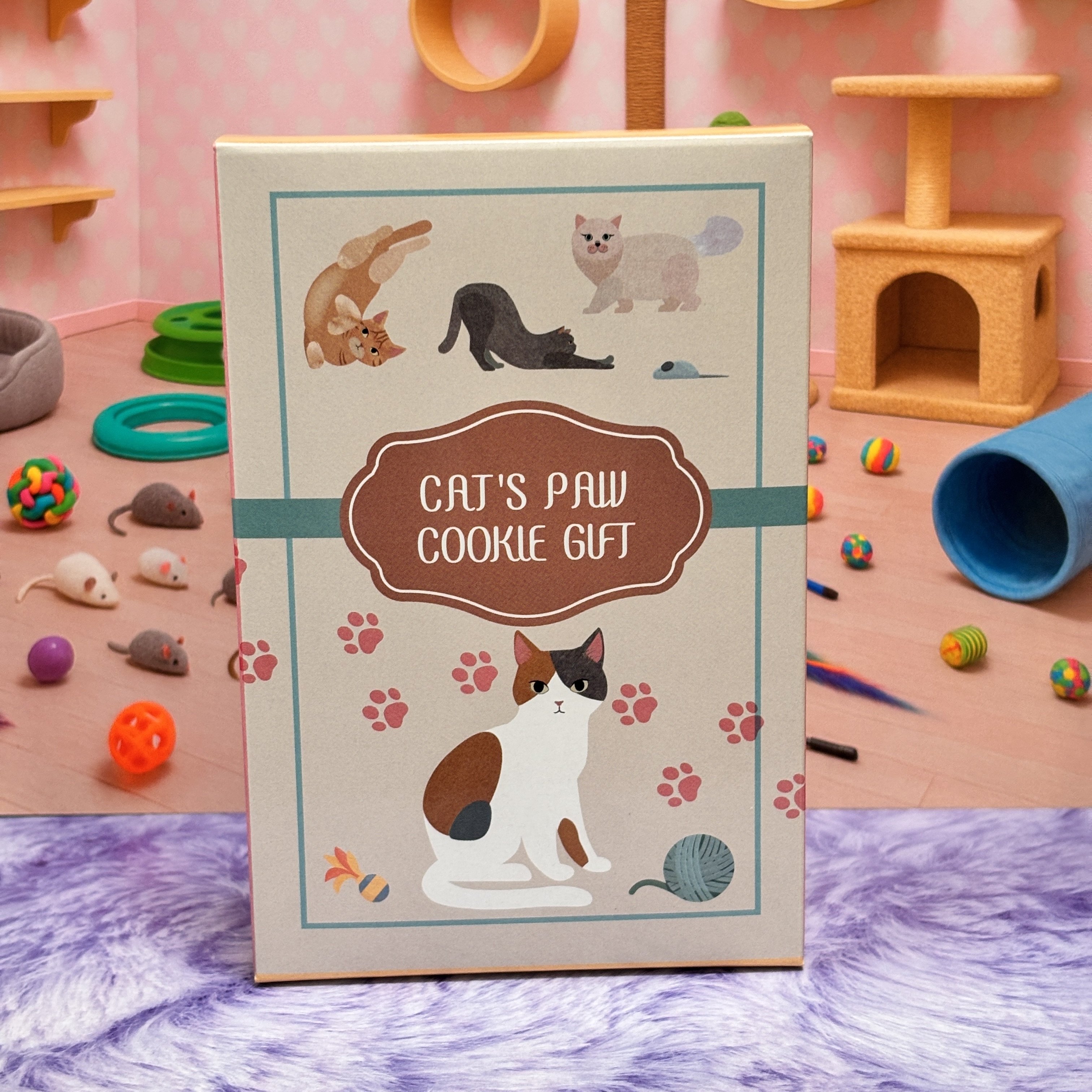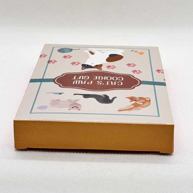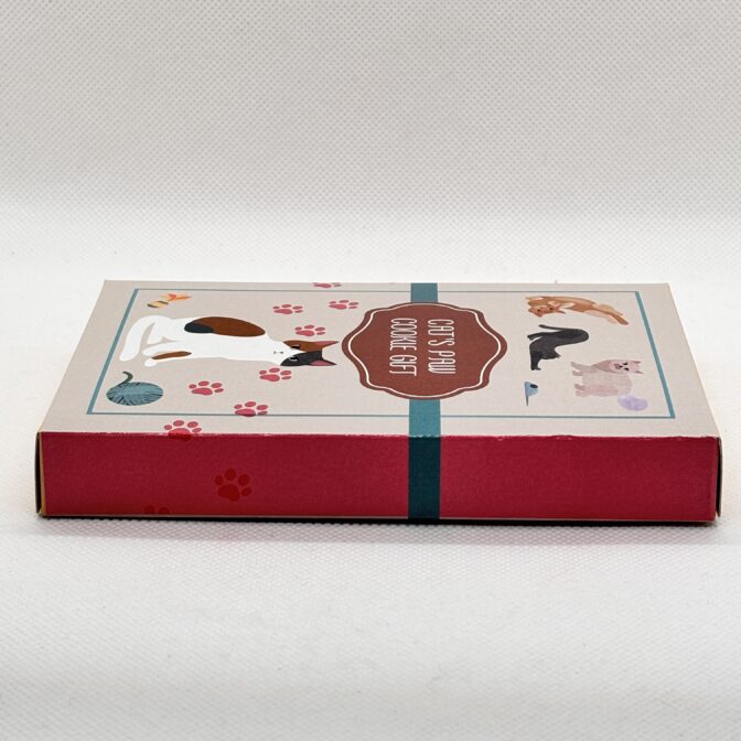 肉球型のクッキー5枚が入ったハガキサイズのギフトボックスです。
