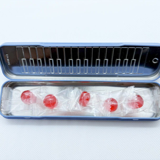 鍵盤ハーモニカを模した缶です。懐かしい鍵盤がスリムなサイズになって手軽で可愛いです。