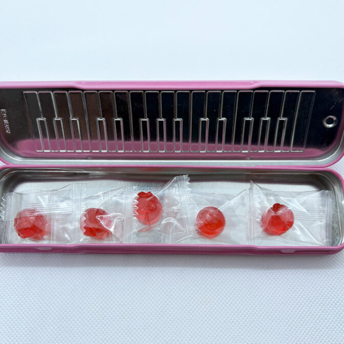 鍵盤ハーモニカを模した缶です。懐かしい鍵盤がスリムなサイズになって手軽で可愛いです。