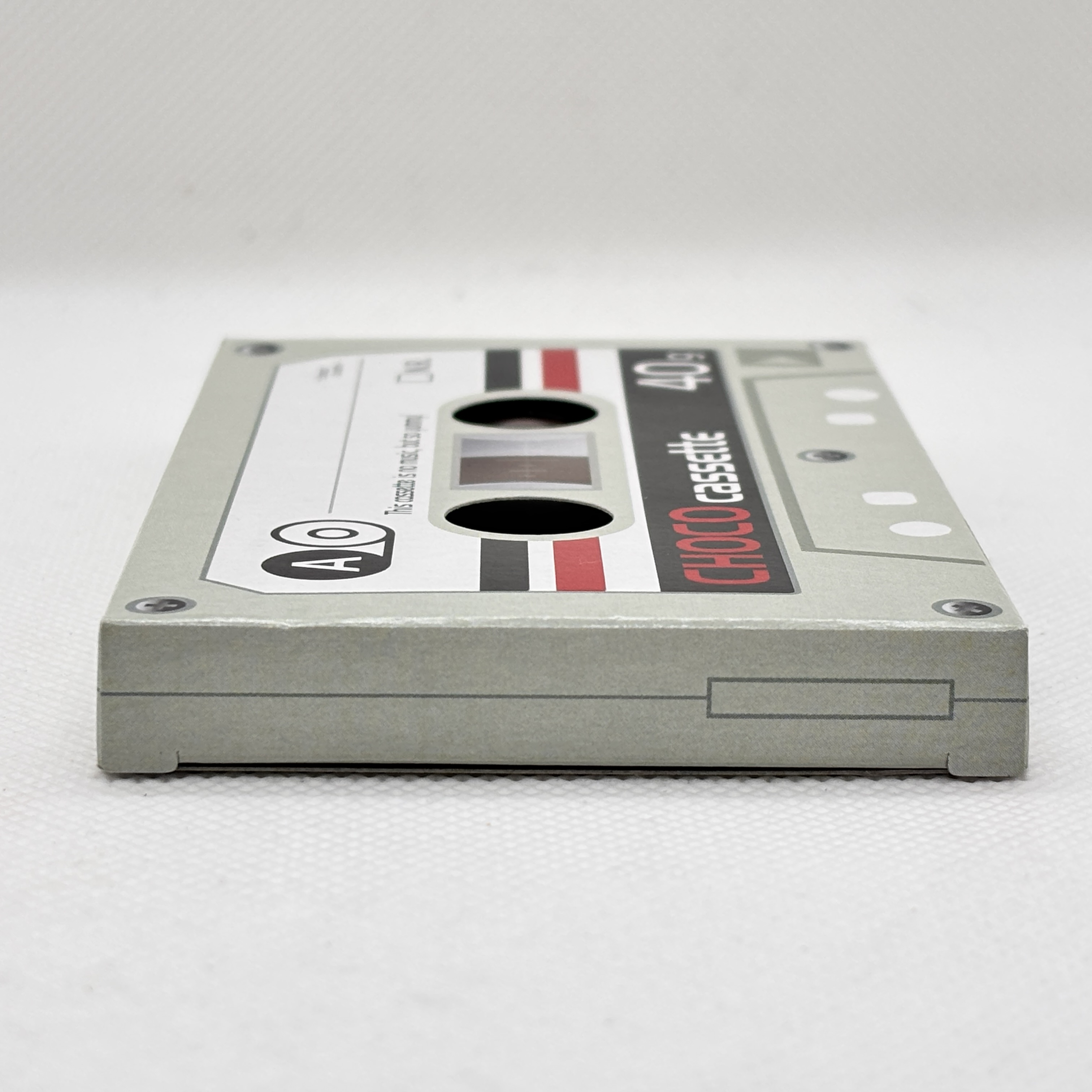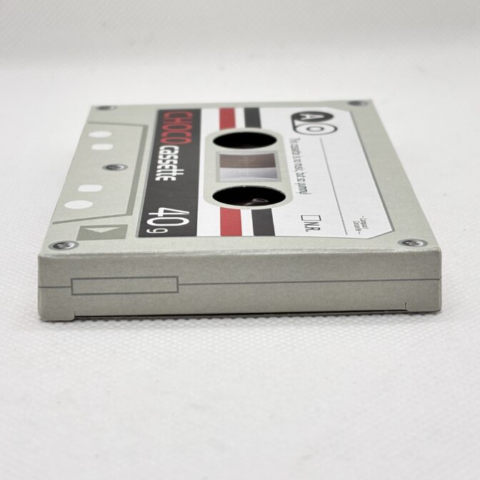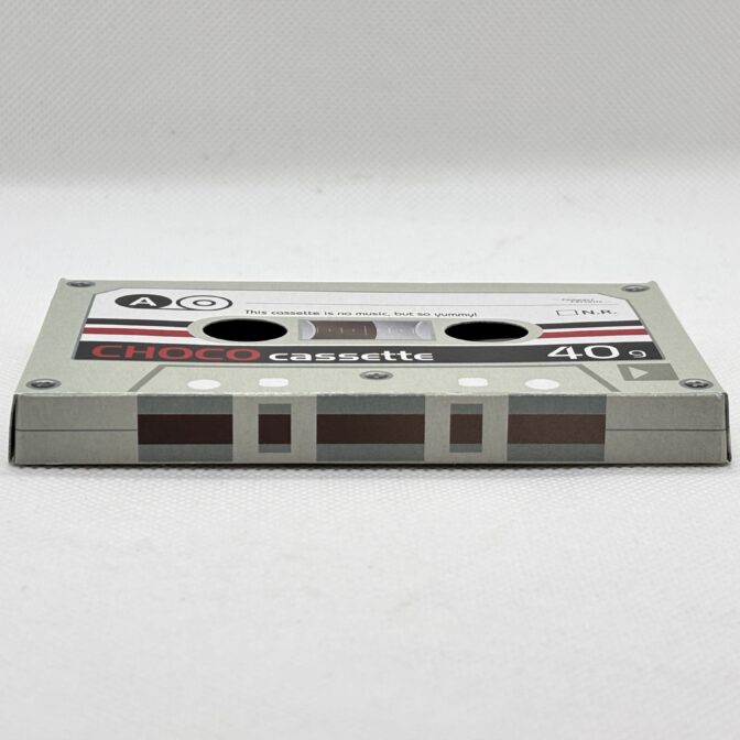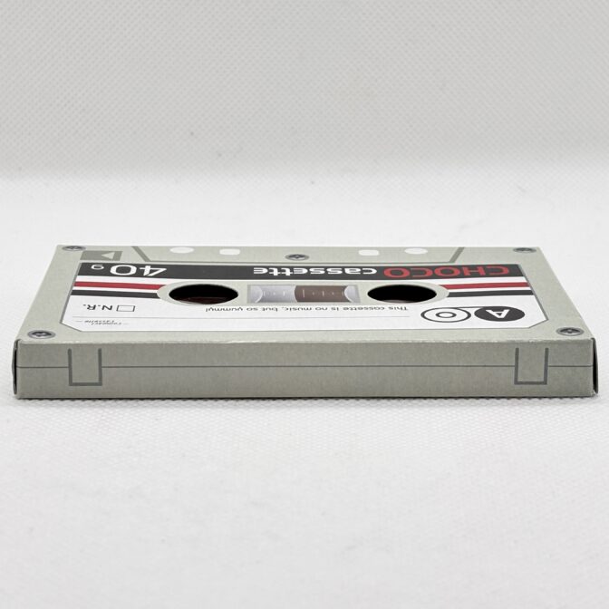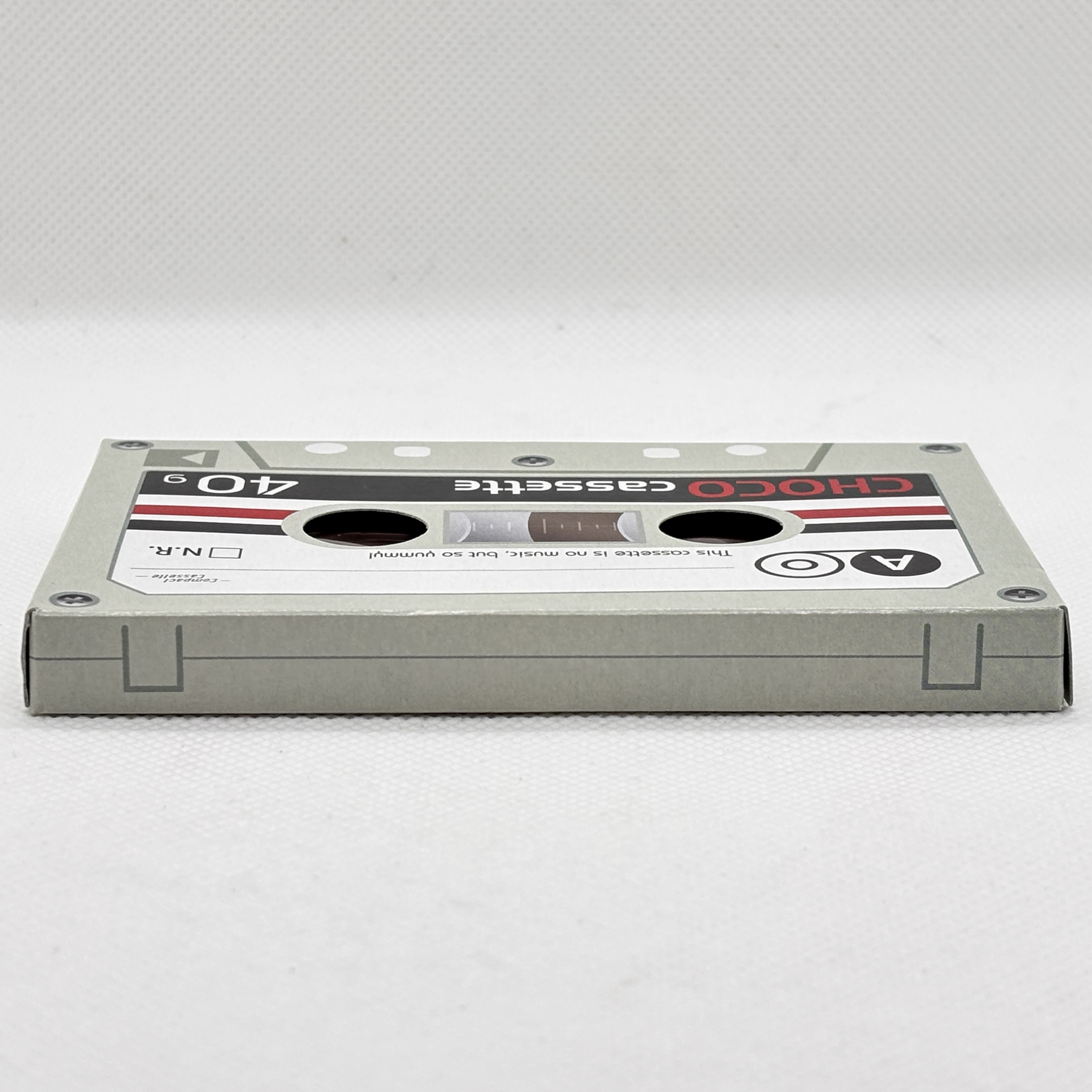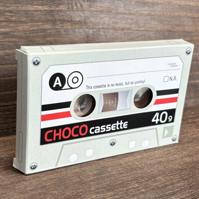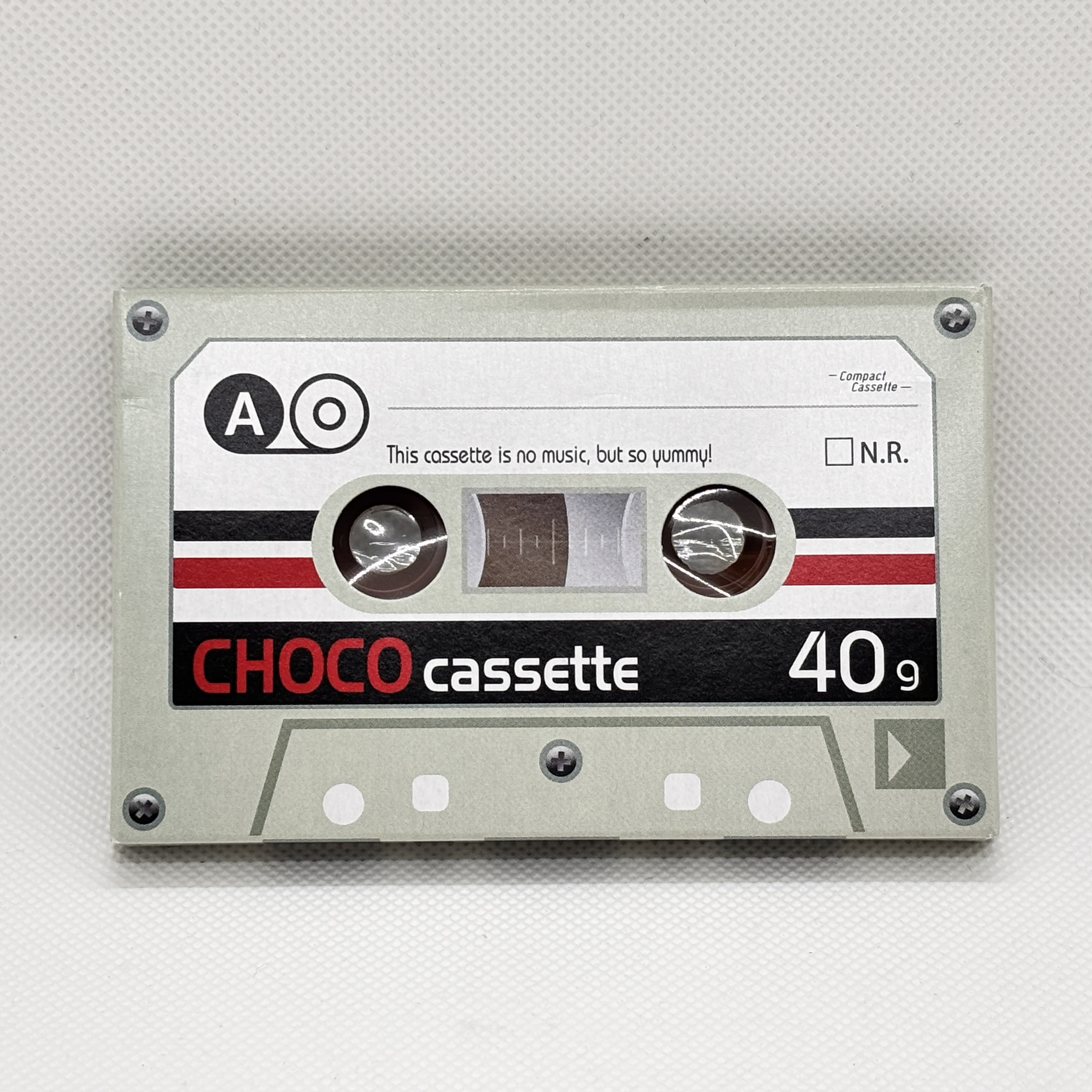 レトロかわいいカセットテープの紙箱の中に、カセットテープ型のチョコレートが入った商品です。
