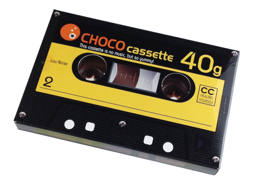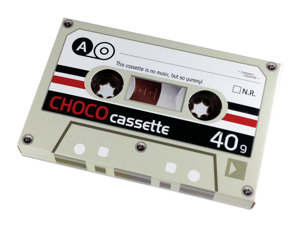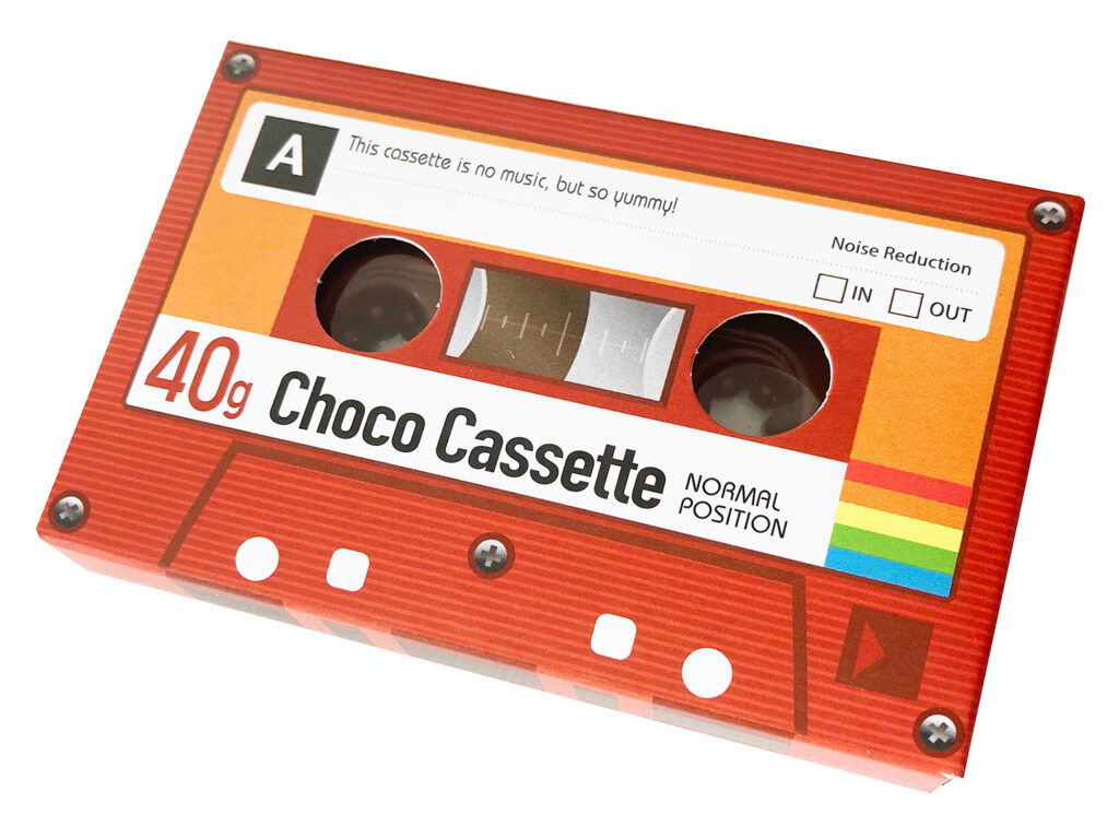 レトロかわいいカセットテープの紙箱の中に、カセットテープ型のチョコレートが入った商品です。