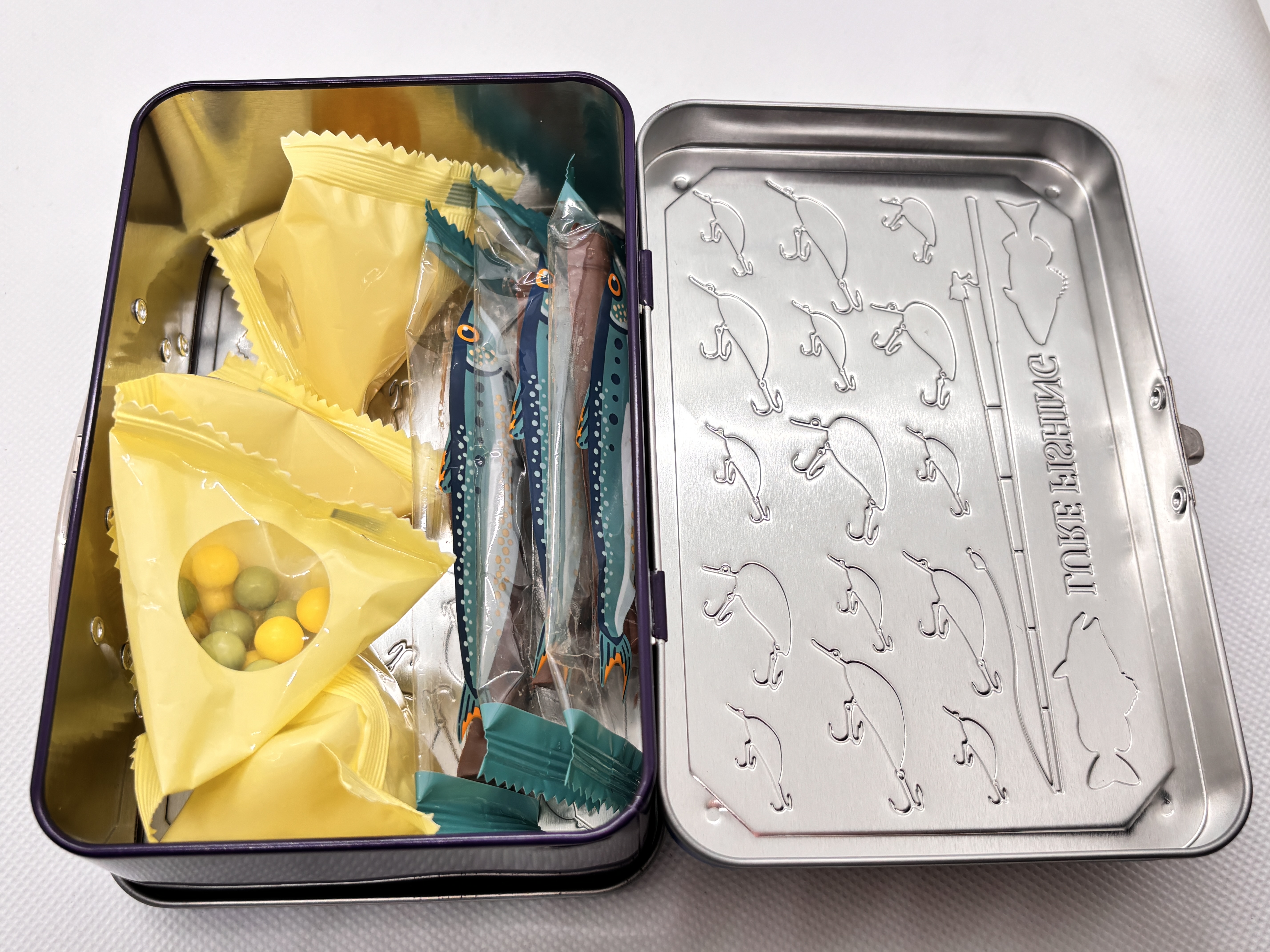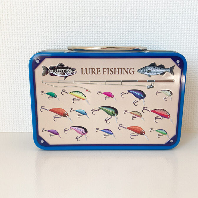 釣り道具をモチーフにした缶です。